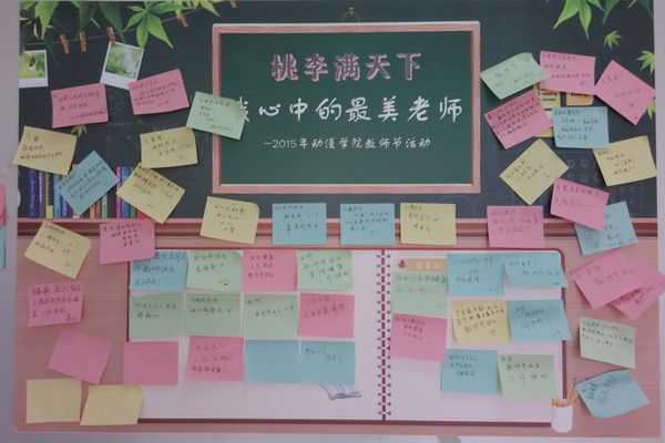 9月9日下午,动漫学院在会议室举行了教师节庆祝大会。会上,执行院长计勇带领大家共同回顾了动漫学院的发展历程,对全体教师一年来的工作给予了高度评价,并希望全体教师树立敬业爱岗的思想,树立主人翁意识,把学院的建设与个人发展有效结合起来,在新华学院,在动漫学院,实现自己的人生理想和价值。此外,动漫学院还开展了“心中的最美教师”活动,在学院公告栏中设立了“心中的最美教师”专区,学生将自己想对老师说的话写在小卡片上,表达对自己心中最美教师的祝福、感激之情。