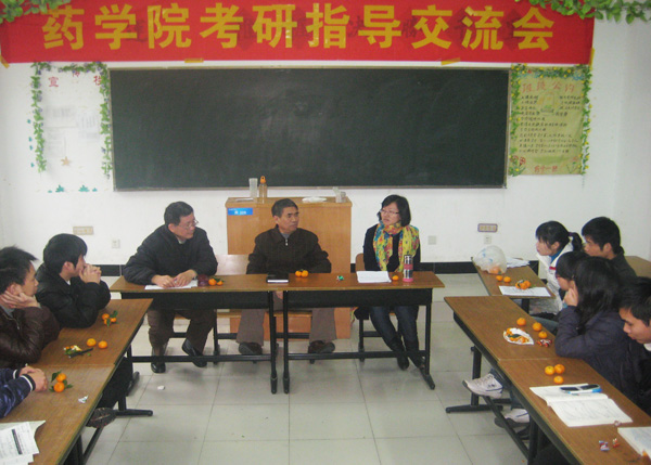 为了给考研学子提供一个授业解惑的平台,营造良好的复习氛围, 鼓励考研学子抓住最后的复习时间。12月7日上午,药学院在召开考研学子指导交流会,药学系主任刘金旗教授、药学院学科带头人张兴法教授、药学系副主任卫强老师、制药工程系副主任曹殿洁老师与药学院近40名考研学子交流考研心得。
