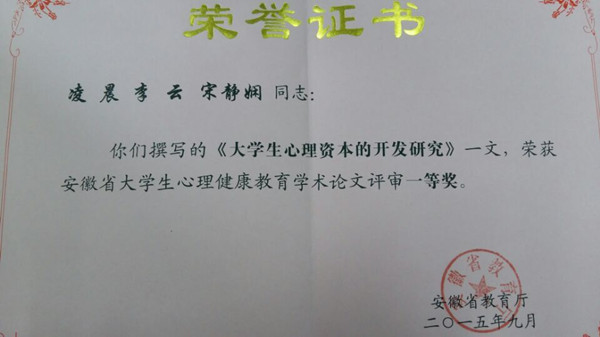本网讯(通讯员:凌晨)日前,pp电子心理老师凌晨、宋静娴共同撰写的论文《大学生心理资本的开发研究》在省教育厅举办的“大学生心理健康教育学术论文征集评选活动”中荣获一等奖。