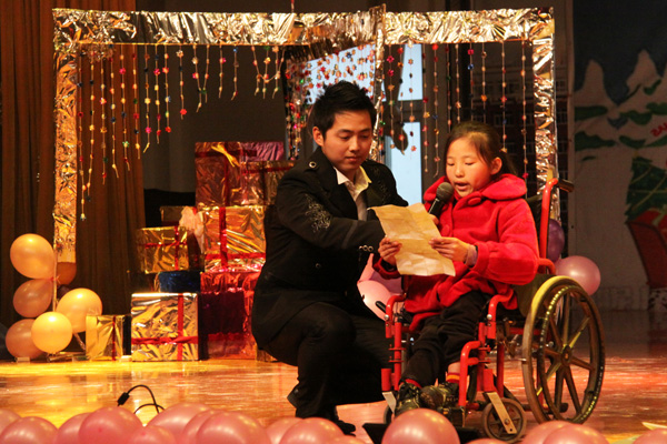 本次晚会特意邀请了外国语学院支教点的合肥市儿童福利院的小朋友,她用甜美纯真的童声,充满深情地朗诵了诗歌《我想要爱》,让我们看到了孩子们水晶般的童心,点燃了大家的爱心之火。