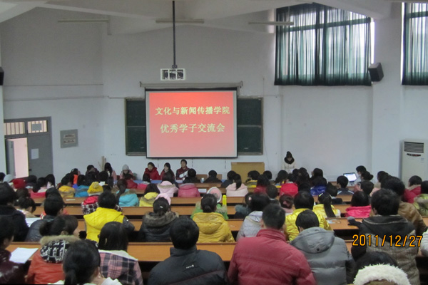 12月27日,文化与新闻传播学院召开优秀学子交流会。获得全国大学生英语竞赛安徽省赛区D类一等奖的2010级新闻采编与制作专业的文雅,获得此次比赛二等奖的2010级新闻采编与制作专业的章燕,以及分别获得本次竞赛安徽省赛区C类二、三等奖的晏贤翠,汤丽平,2010级广告专业的谢文品等交流了他们的感悟。