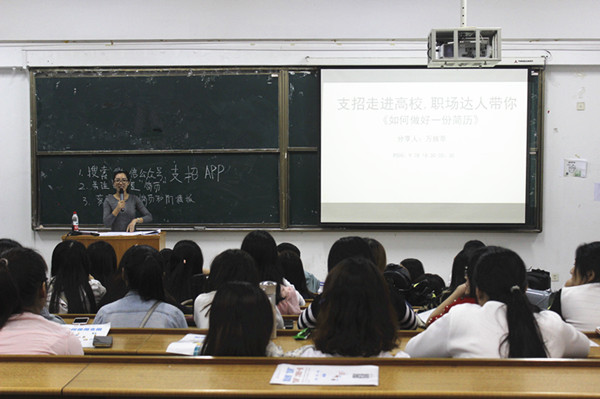 万拔萃以自己在刚毕业时面对就业迷茫的经历,告诉在场学生简历制作的重要性,指导学生如何在简历中体现制定化和个性化,突出自己的个性。她还以“态度”“温度”“匹配度”几个关键词高度概括面试时应该注意的事项。