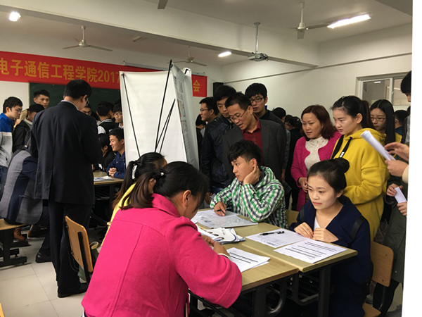 本网讯(通讯员:朱玉娟,摄影:储金华)为切实做好毕业生就业工作,大力构建毕业生与用人单位的交流平台,10月26日下午,电子通信工程学院举办2017届毕业生专场招聘会,泰瑞达(上海)有限公司合肥分公司、昆山宏致电子有限公司、上海瑞禾通讯技术有限公司、合肥兴联通讯有限公司等28家企业现场招聘,约700名同学参加本次招聘会。