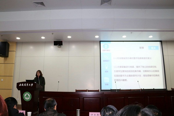 本网讯(通讯员:张欣)11月24日至26日,第二届安徽省高校图书馆服务创新案例大赛决赛在安徽农业大学举行,pp电子由图书馆副馆长汤干君带队,信息咨询部贺滔、张欣两位教师组成的参赛组参赛。pp电子图书馆申报的《典藏云集、走近图书——民办高校图书馆经典阅览室建设》案例荣获大赛三等奖。