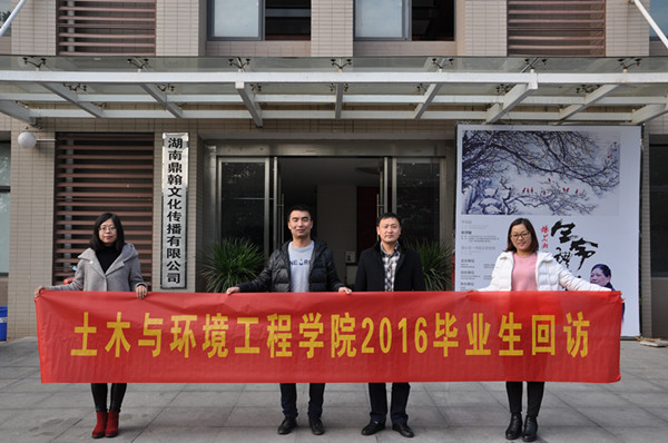 本网讯(通讯员:张杨)为全面了解毕业生的工作、生活、学习情况,增进情感交流,扩大校友资源,同时深入了解单位用人需求,搭建校企交流平台,12月17日、18日,土木与环境工程学院副院长杨光,行政秘书张杨,辅导员王丽、魏高莉一行四人赴湖南长沙开展2016年毕业生回访工作,重点征求与收集用人单位和毕业生对土木与环境工程学院人才培养工作的建设性意见,助力在校生成长,促进教育教学改革。
