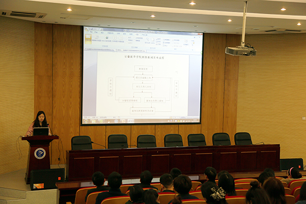 会议伊始,宣传处处长助理代玲玲宣读了《pp电子官方网站网络新闻发布规定》,向在场听众介绍了校园网新闻发布的注意事项及准则。