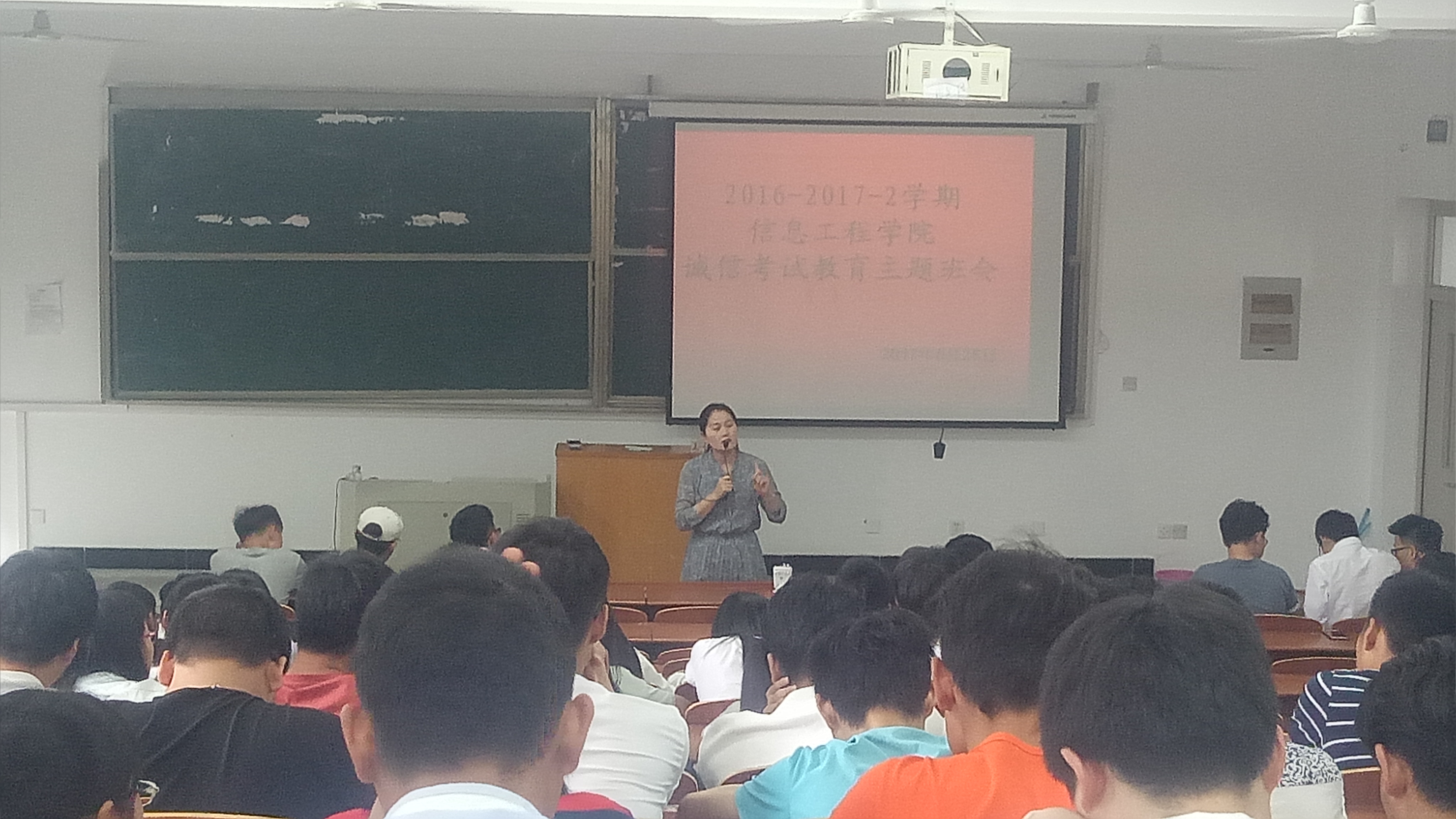 本网讯(通讯员:彭智)期末考试来临之际,为了使同学们树立诚信考试观念、严肃考风考纪,提高其自我管理能力,5月份,信息工程学院各班级在辅导员的指导下开展了以“诚信考试”为主题的系列活动。