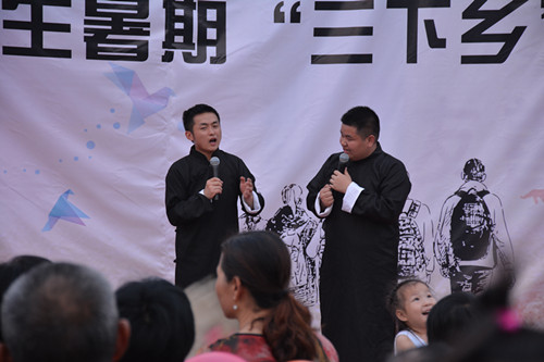 在前往目的地的途中,大家按耐不住心中的激动唱起了团歌,为此次“三下乡”活动营造了一个良好的氛围。到达西城村之后,成员们受到当地人民的热烈欢迎,柯姗姗与共青团白湖镇委员会书记顾城、西城村党委书记、庐江县委组宣部部长进行了简单的交流讲话后,成员们开始对当地方言、儿童文阅读量以及老人们的文化娱乐生活展开了一系列的调研活动。除此之外,成员们还同当地小学生们互动打乒乓球,增进了彼此间的情感交流,为接下来的实践活动奠定下了良好的基础。落日时分,校大学生艺术团为村里的百姓带来了街舞、歌曲、相声、乐器演奏、模特走秀等文艺演出,形式丰富多彩,收获了众多观众的热烈掌声与喝彩。