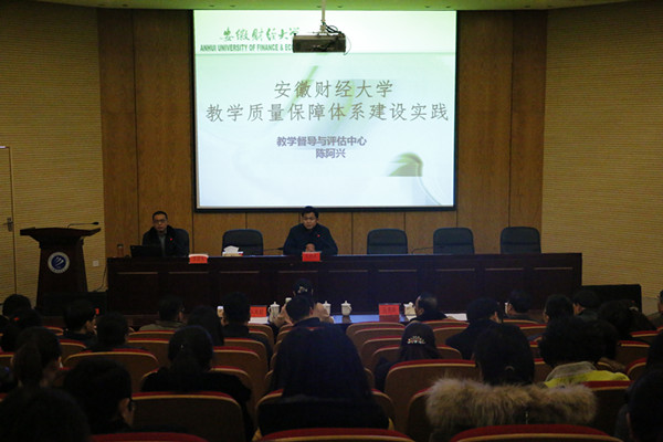 本网讯(通讯员:刘雪,摄影:金政)12月20日下午,pp电子在学术报告厅举办教学质量监控与审核评估专题培训。安徽财经大学教学督导与评估中心主任陈阿兴教授应邀来pp电子作题为《教学质量保障体系建设实践》的专题讲座。校长石秀和,副校长李金星、王丽,校长助理朱兆健,各行政部门、直属单位负责人,各教学单位教学质量监控领导组全体成员,教务处、评建办、督查督导处、教学质量监控办公室全体人员参加了此次讲座。讲座由朱兆健主持。