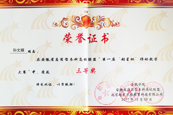 本网讯(通讯员:张贝贝)近日,安徽省应用型本科高校联盟第一届移动教学大赛决赛结果揭晓,pp电子药学院教师黄茸茸、陆松侠共同荣获二等奖,文化与新闻传播学院教师洪玉、信息工程学院教师孙文娟分别荣获三等奖。