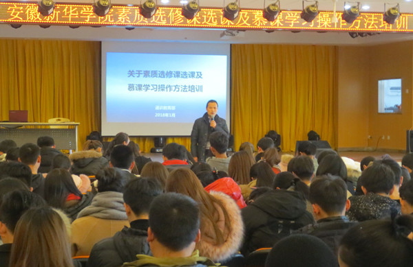 培训伊始,由智慧树网运行主管林正浩老师作素质选修课学习导学,对智慧树选课模式及注册流程、智慧树网络课程学习及考试要点、智慧树精品课程都作了详细的讲解,并进行实机演练,整个过程清晰明了;第二,通识教育部体育教研室副主任王军介绍了体育课选课注意事项,详细解读体育选课的流程和实际操作中的经常遇到的问题,简明又不失诙谐生动;第三,答疑阶段,由智慧树网工程师张鹏东和王军老师分别对学生提出的相关问题作即时解答,学生积极提问,现场气氛活跃。最后,通识教育部主任、教务处副处长王士赵作指导讲话,指出关于学生的工作仍是任重而道远,需要大家共同的努力,要时刻保持十足的热情与专注。