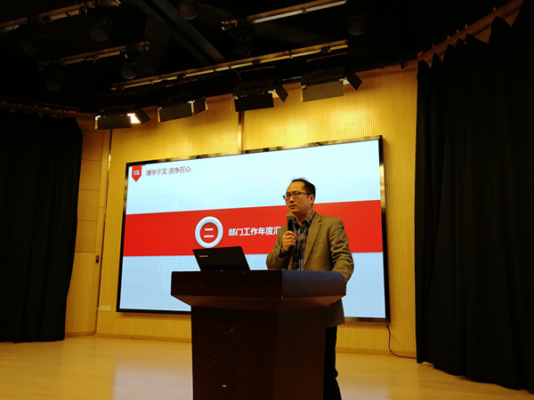 文化与新闻传播学院党总支书记、执行院长翟荣兵从学院基本情况、教学工作、教师队伍建设、党团学生工作和工会、行政工作等五个方面总结了学院过去一年中的收获和成效。他表示,2018年要进一步加强校园文化建设,突出特色定位,加强人才引进与培养,提升硬件设施保障,提高教育教学质量。他要求,全体教职工要进一步认真学习党的十九大精神,并号召全体教职工共同努力,在学院的建设道路上披荆斩棘,破浪前行,勇往直前!