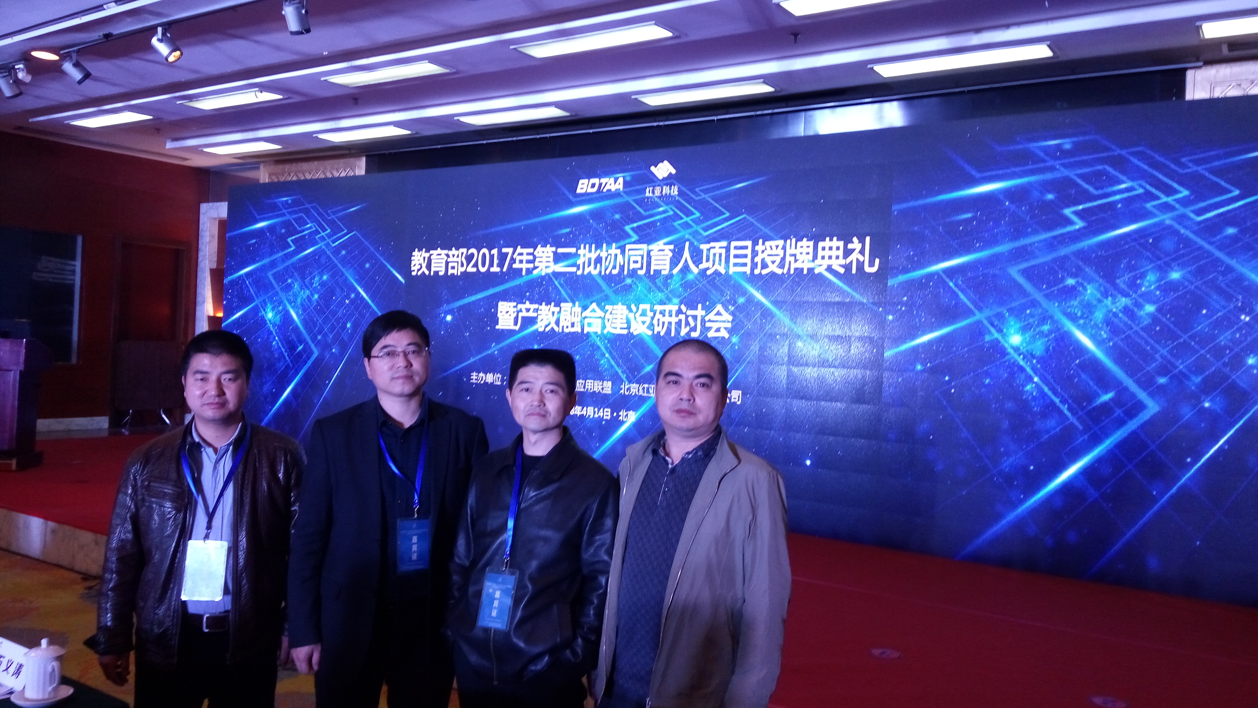 本网讯(通讯员:路贺俊)4月14日,pp电子信息工程学院万家华一行四人参加了教育部2017年第二批协同育人项目授牌典礼暨产教融合建设研讨会,本次大会由中国大数据技术与应用联盟与北京红亚华宇科技有限公司联合举办,信息工程学院项目负责人路贺俊代表pp电子接受教育部高等教育司与北京红亚华宇科技有限公司联合颁发的“实践条件建设合作项目”授牌。