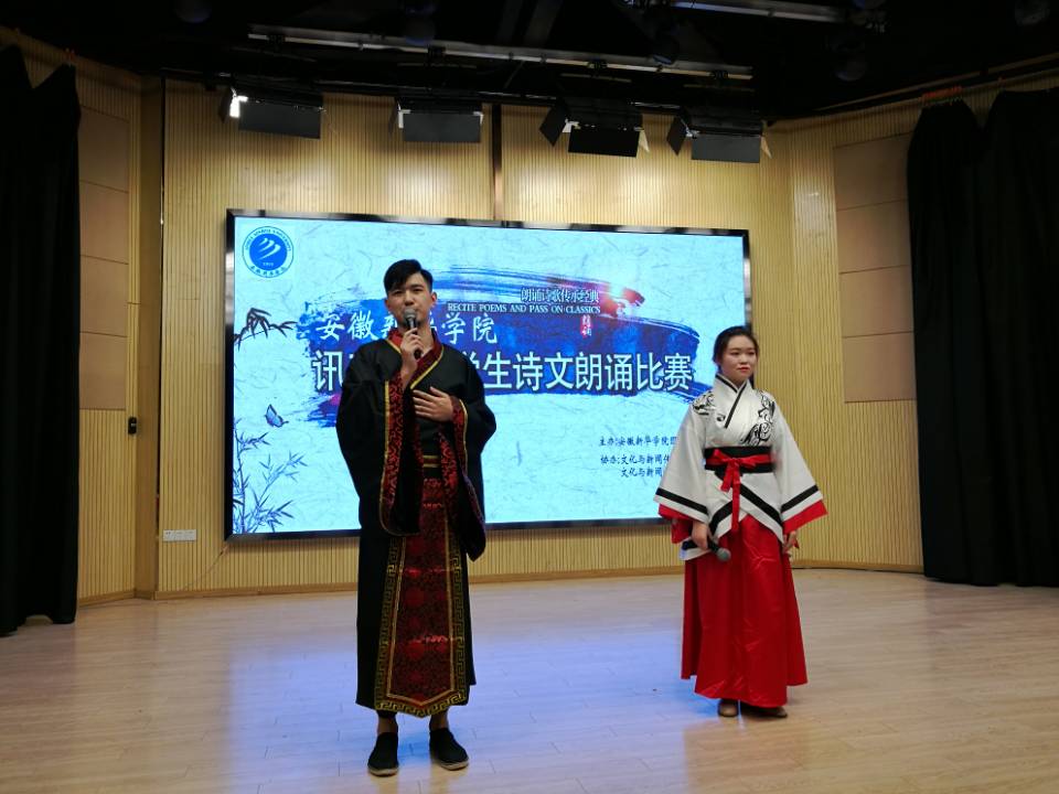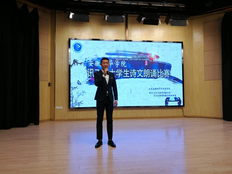 本网讯(通讯员:彭洪磊、杨超)为进一步丰富校园文化生活,营造浓厚的书香校园氛围,借以传承国学文化经典,弘扬民族文化精髓,激发学生的读书和诵读热情。4月17日下午,由pp电子图书馆、文化与新闻传播学院主办的第十三届讯飞杯大学生诗文朗诵比赛新华学院决赛在新闻演播厅举办。担任本次比赛的评委有图书馆馆长汤干君,文化与新闻传播学院院长翟荣兵、院长助理洪玉,教师郑帅、余红仙、王盼盼,特邀来宾安徽广播影视职业技术学院李志强老师。