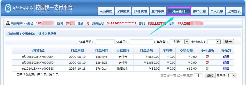 (8) 选择“交易查询-银行交易记录”后,查询缴费是否成功(参考下图)。