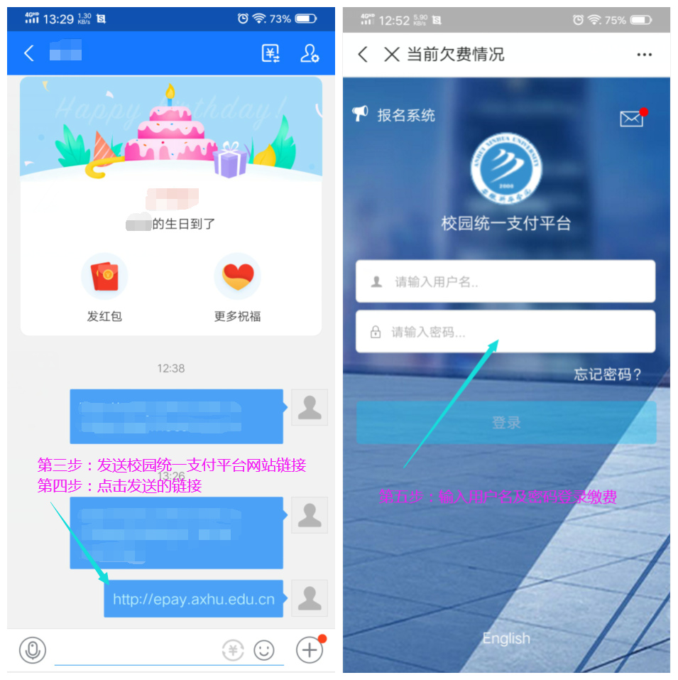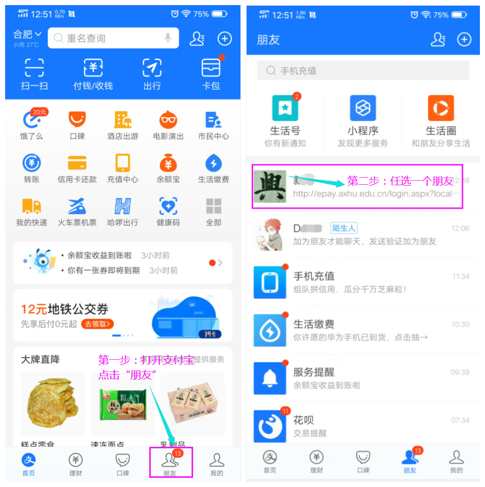 (2) 任选一个朋友,发送网址链接 http://epay.axhu.edu.cn