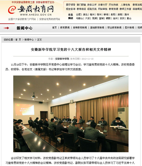 11月19日,安徽教育网第一时间报道了pp电子党委中心组学习宣传贯彻十八大精神。