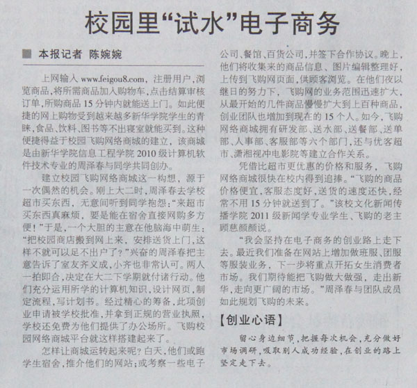 输入、注册用户,浏览商品,将所需商品加入购物车,点击结算审核订单,所购商品15分钟内就能送上门。如此便捷的网上购物受到越来越多新华学院学生的青睐,食品、饮料、图书等不出寝室就能买到。这种便捷得益于校园飞购网络商城的建立,该商城是由新华学院信息工程学院2010级计算机软件技术专业的周泽春与同学共同创办。