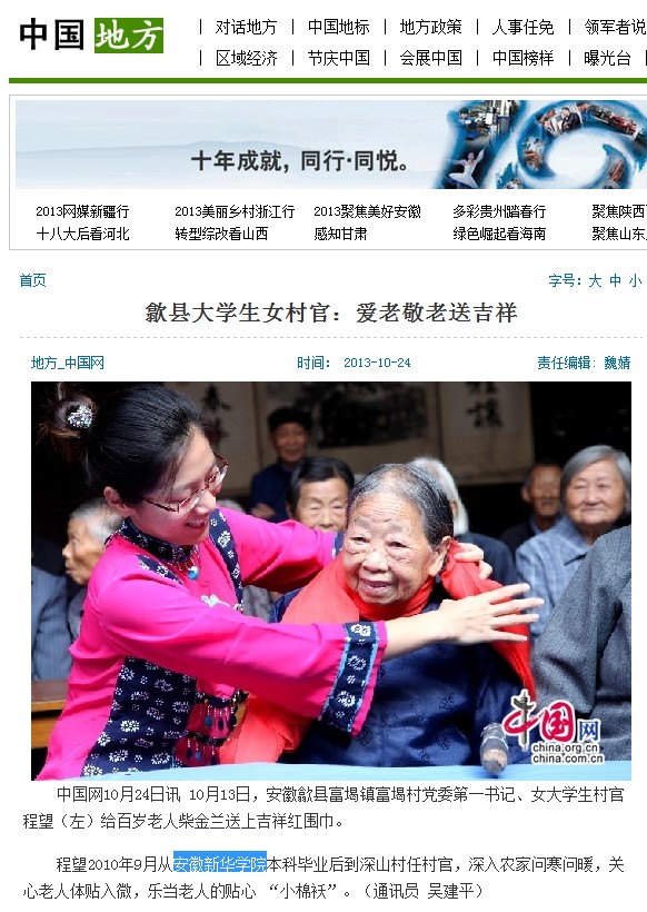 中国网: 歙县大学生女村官:爱老敬老送吉祥