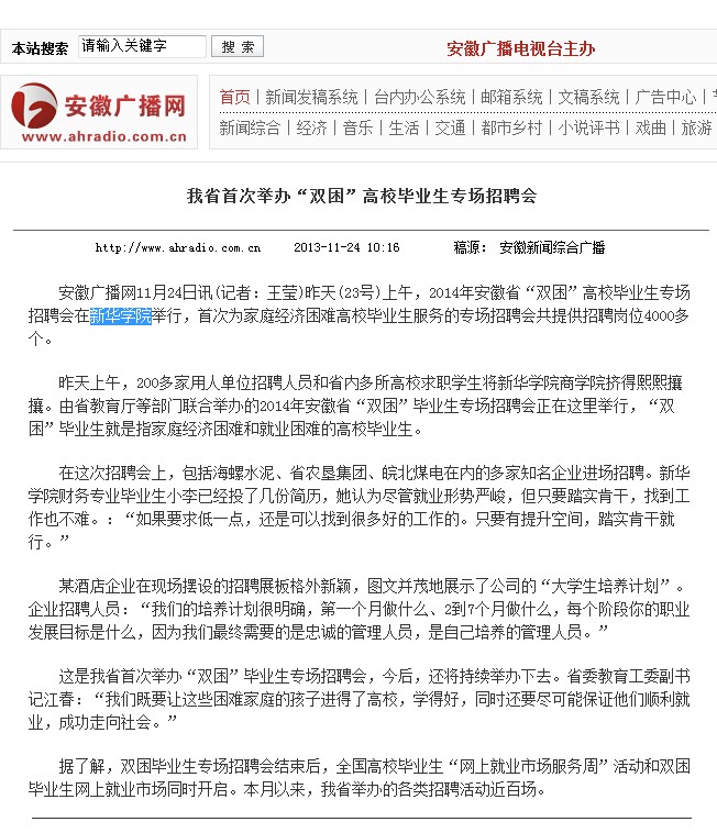 安徽省广播电台:我省首次举办“双困”高校毕业生专场招聘会