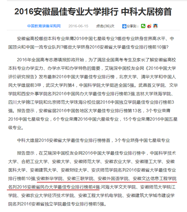 搜狐网:2016安徽最佳专业大学排行