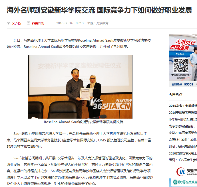 中国教育在线、UC头条:马来西亚理工大学Roselina Ahmad Saufi教授来pp电子官方网站交流访问