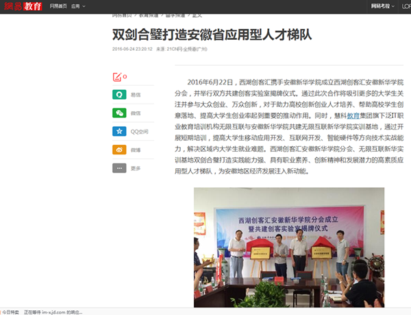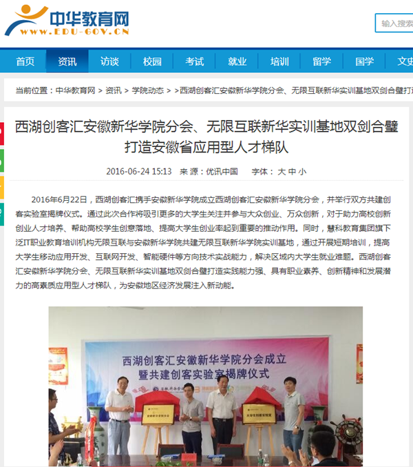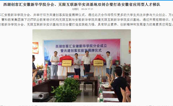 光明网、中华教育网、网易教育:西湖创客汇pp电子官方网站分会、无限互联新华实训基地双剑合璧打造安徽省应用型人才梯队