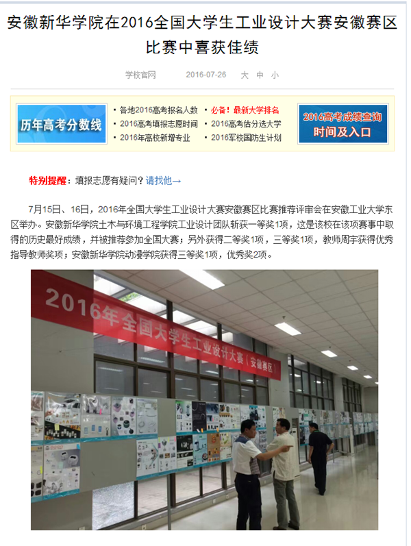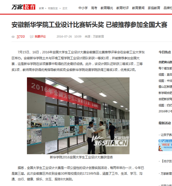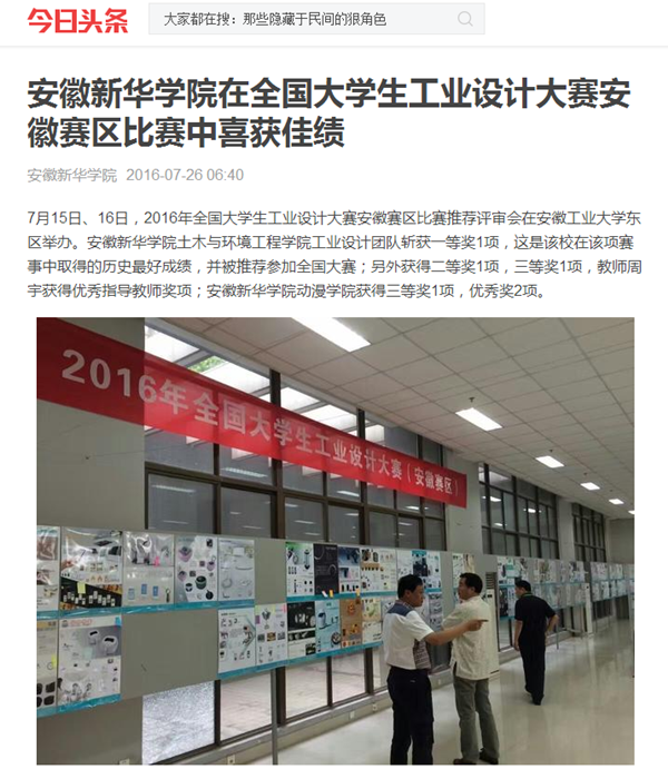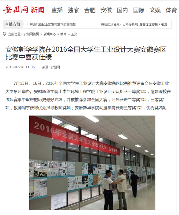 中国教育在线、今日头条、安徽网、万家热线、UC头条、新安晚报微博:pp电子官方网站在2016全国大学生工业设计大赛安徽赛区比赛中喜获佳绩