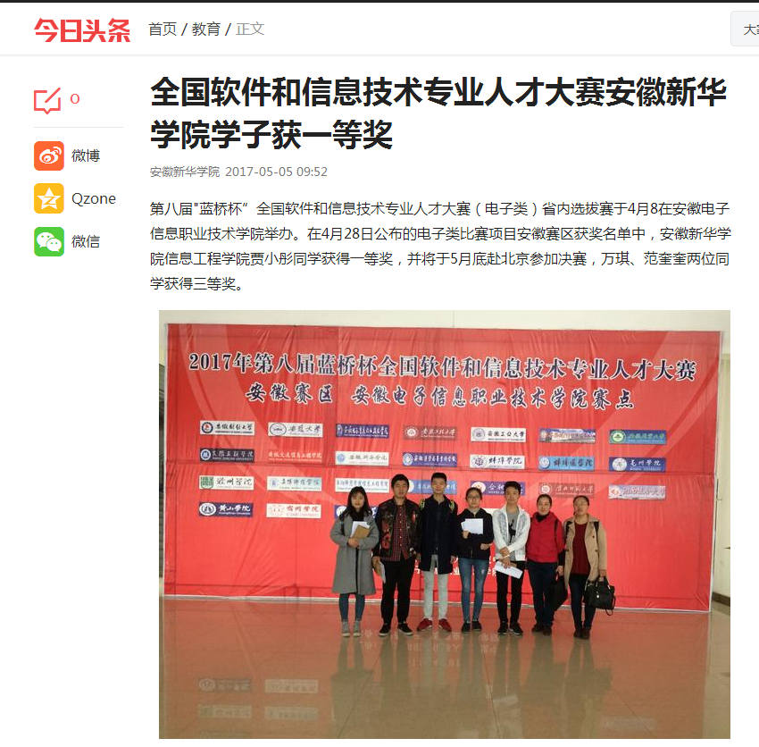 中国教育在线、今日头条:pp电子官方网站学子获第八届"蓝桥杯"全国软件和信息技术专业人才大赛(电子类)省赛一等奖