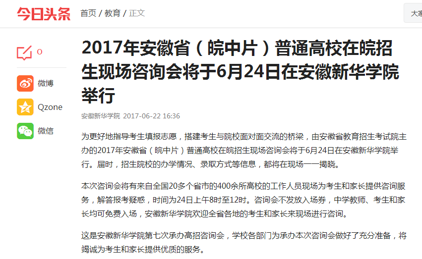 今日头条:2017年安徽省(皖中片)普通高校在皖招生现场咨询会将于6月24日在pp电子官方网站举行
