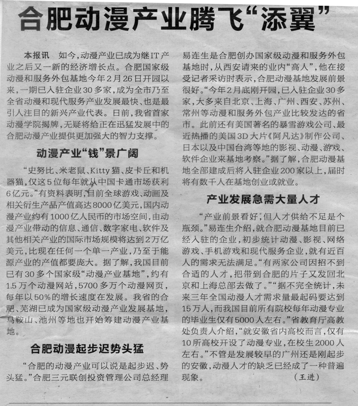 《合肥晚报》:合肥动漫产业腾飞“添翼”