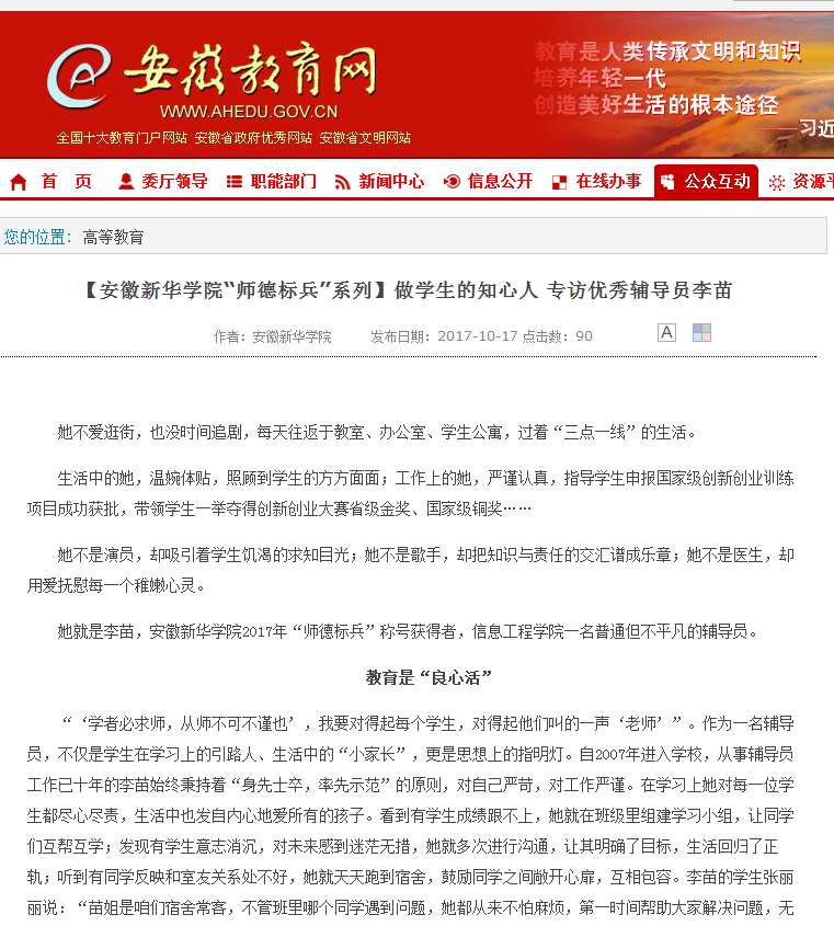 安徽教育网:【pp电子官方网站“师德标兵”系列】做学生的知心人 专访优秀辅导员李苗