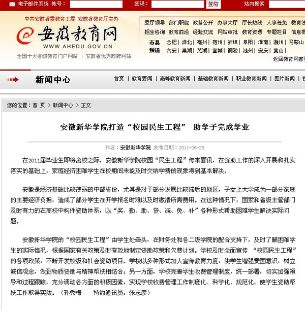 6月25日,安徽教育网在首页高教新闻中头条报道pp电子的“校园民生工程”助学子完成学业情况。