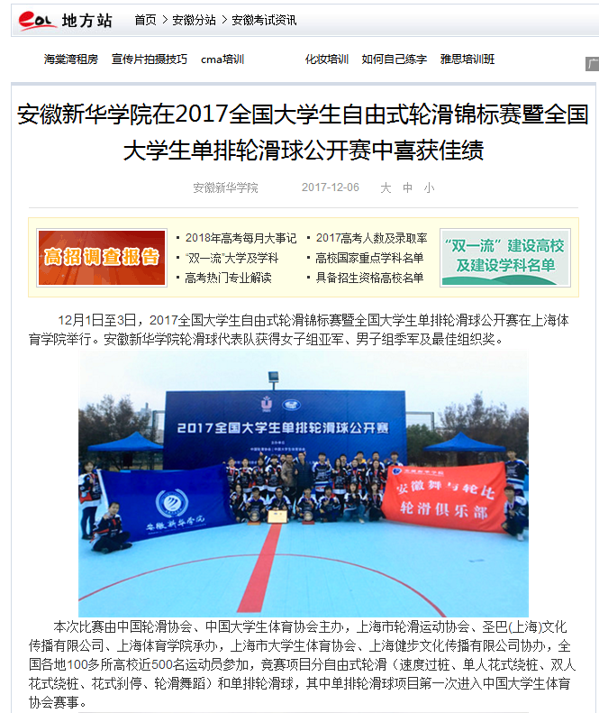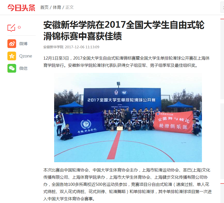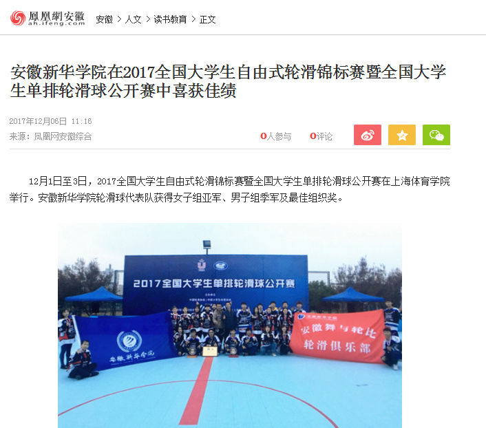 中国教育在线、凤凰网安徽、今日头条、搜狐网: pp电子官方网站在2017全国大学生自由式轮滑锦标赛暨全国大学生单排轮滑球公开赛中喜获佳绩
