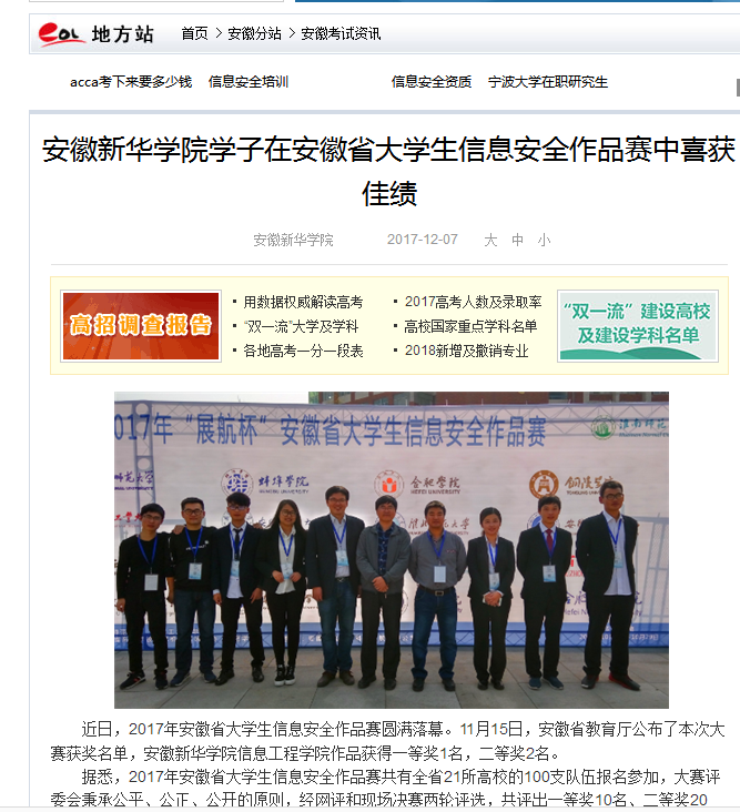 中国教育在线:pp电子官方网站学子在安徽省大学生信息安全作品赛中喜获佳绩