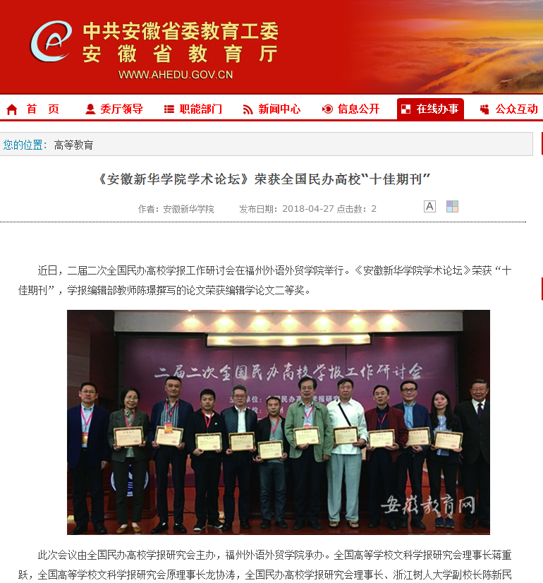安徽教育网:《pp电子官方网站学术论坛》荣获全国民办高校“十佳期刊”