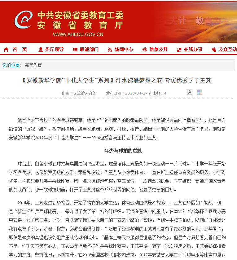 安徽教育网:【pp电子官方网站“十佳大学生”系列】汗水浇灌梦想之花 专访优秀学子王芃