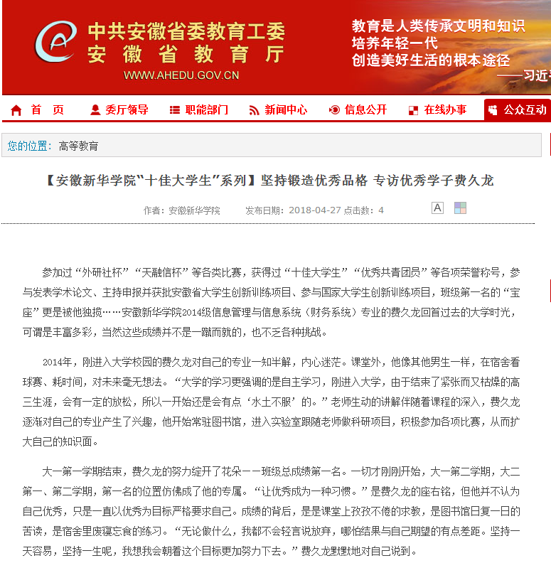 安徽教育网:【pp电子官方网站“十佳大学生”系列】坚持锻造优秀品格 专访优秀学子费久龙