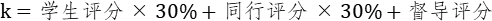 K为每门次课程教学质量综合评分;每门次课程学生评价、同行评价、督导评价所占权重分别为30%、30%、40%。